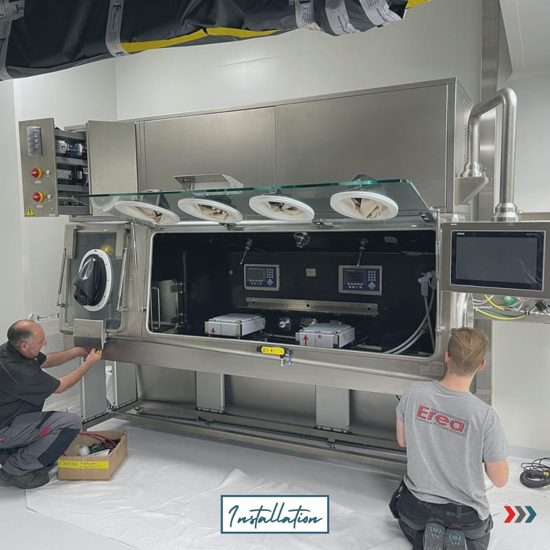 Cet équipement est un poste de travail simple, composé d’un SAS d’entrée à 1 gant, d’une chambre principale de 4 gants. L’isolateur EREA intègre deux balances, des passes cloisons, un pistolet à eau et un système CIP de nettoyage automatique. Une équipe s’est rendue sur place pour réaliser l’installation et la mise en route de l’équipement. La SAT au sein des locaux de l’entreprise cliente est terminée et s’est bien déroulée !